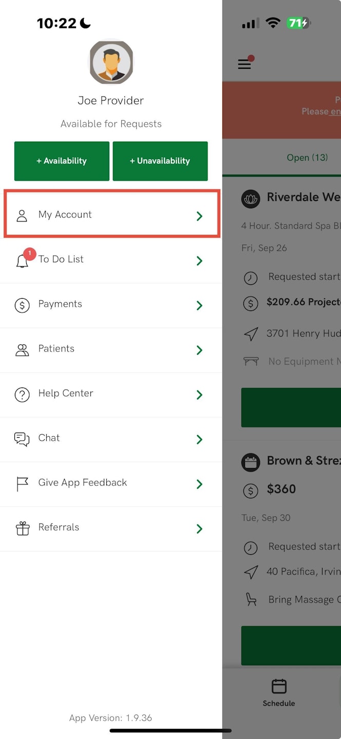 In order to upload your COI please select "My Account" from the sidebar menu of your provider app, select "Credentials" and follow the on-screen update prompts!