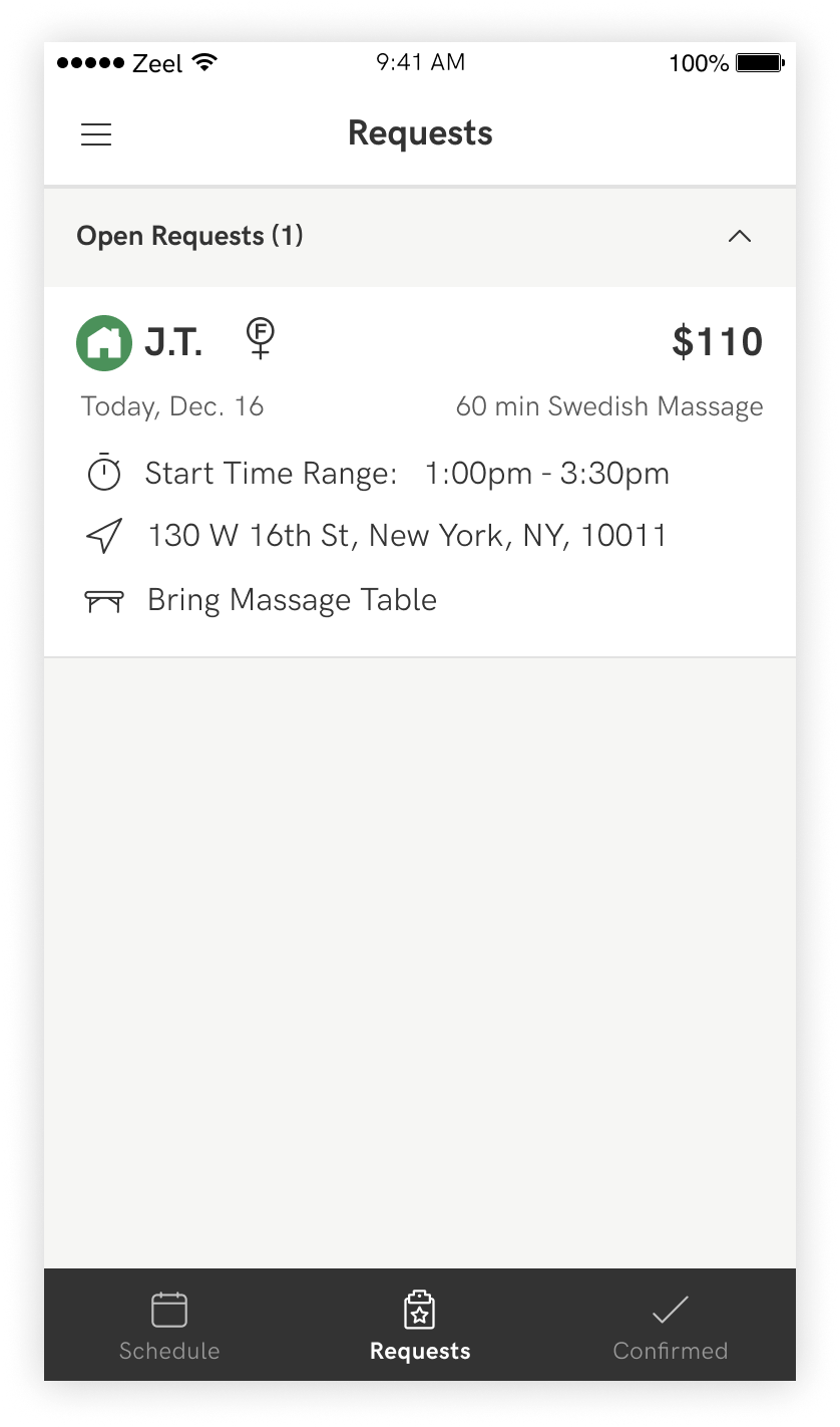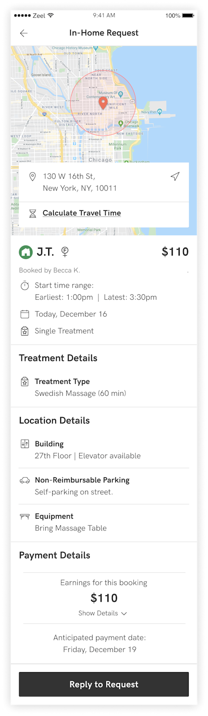 You can also review detailed information about the location and parking information, including a link to your preferred map app, so you can accurately estimate your potential travel time. Review these details thoroughly before responding to the request, so you can provide a truly accurate hands-on start time. It’s important to be realistic about your arrival time—the most common complaint we receive from clients is the therapist arriving late. You’ll set yourself up for success by planning ahead!