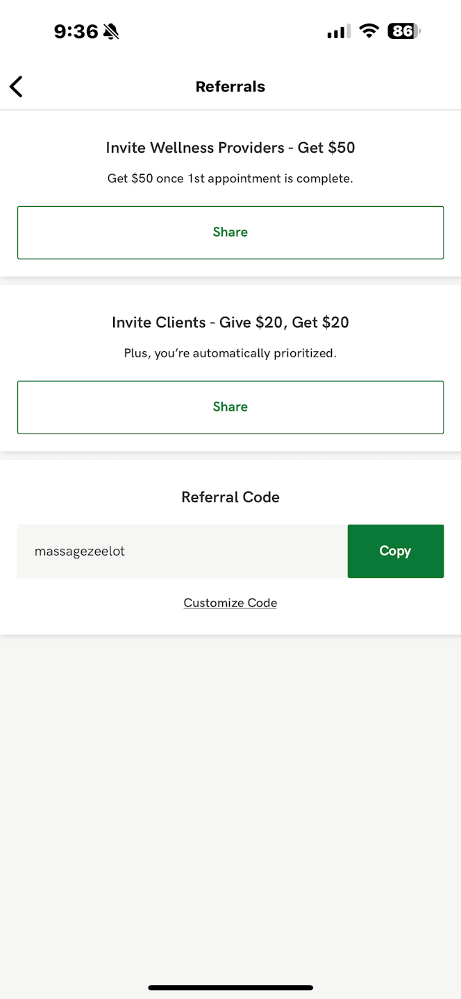 Providers: When a referred provider joins Zeel using your code and completes their first appointment, you’ll receive a bonus.